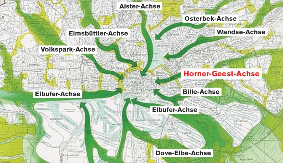Die Landschaftsachse Horner Geest bietet zukünftig die Chance, auf einer Länge von über 9 km eine durchgängige Grün-, Biotop-, Erlebnis- und Mobilitätsverbindung von der Innenstadt (Hauptbahnhof) bis in die ‚freie Landschaft‘ (Öjendorfer Park) zu realisieren. Sie durchquert ein städtebaulich wie sozio-kulturell äußerst heterogenes Stadtgefüge bestehend aus den Stadtteilen St. Georg, Borgfelde, Hamm, Horn und Billstedt. Die Landschaftsachse spielt neben ihrer verbindenden, stadtökologischen und klimatischen Funktion daher auch eine bedeutende Rolle als sozialer Interaktionsraum für die angrenzenden und teilweise dicht besiedelten Quartiere. Naturräumlich tritt besonders prägend der Geesthang in Erscheinung, der bislang aber wenig identitätsstiftend wirkt.